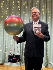 Pfarrer Matthias Lotz mit dem gemeinsamen Geschenk der Pfarrgemeinderäte und Kirchenverwaltungen aus Höchberg und der Zellerau: Einem Gutschein für eine Ballonfahrt sowie dem Sonderpfarrbrief, der als Überraschung zu seiner Verabschiedung erstellt worden war.